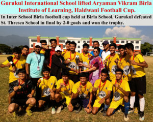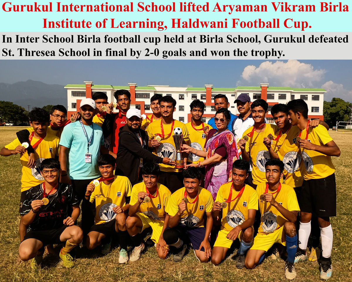 Gurukul International School lifted Aryaman Vikram Birla Institute of Learning, Haldwani Football Cup. In Inter School Birla football cup held at Birla School, Gurukul defeated St. Thresea School in final by 2-0 goals and won the trophy. webadmin October 25, 2024 Latest Events